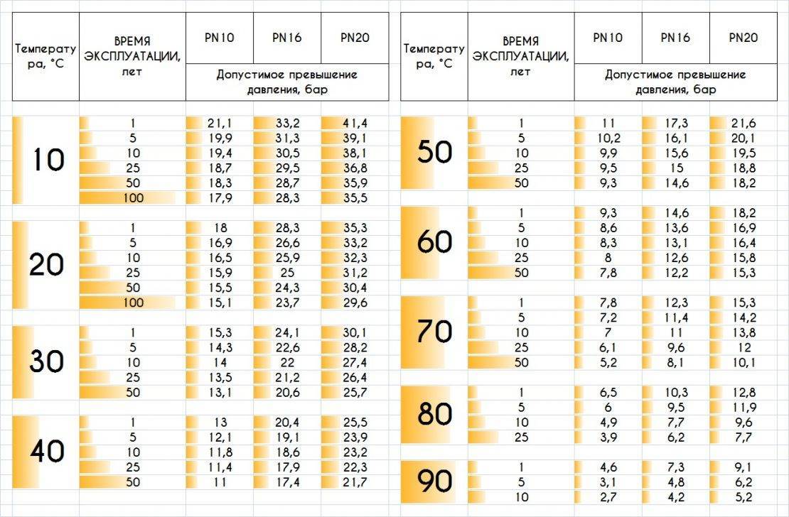 - PN-10. Допустимый уровень давления 1 МПа при прогреве теплоносителя до +20 С в системах ГВС и до +45 С в контурах теплых полов. Для формирования тепловых магистралей не применяется.