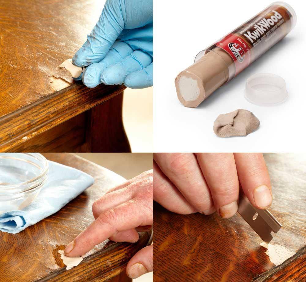 Скол – это значительный дефект, который устранить не так просто, как царапину. Если от столешницы, выдвижного ящичка, ножки отвалился кусок дерева или ДСП, то потребуется восстановить его вручную. Для этого используются: