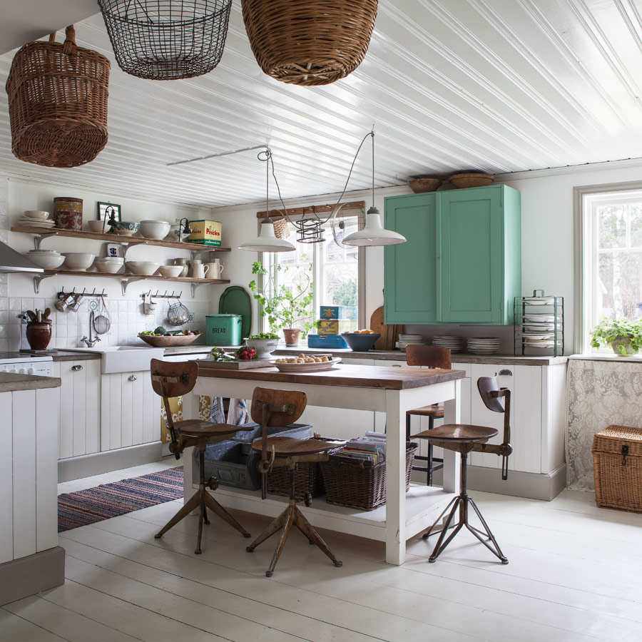 Потребуется использование функциональных полок из натурального бруса. Полки красивые на кухню, выполнены из массивного, состаренного дерева, дополненные плетеными корзинами, сундучками. Цветовую палитру лучше подобрать оттенков: светлый беж, серый, пастельных тонов.