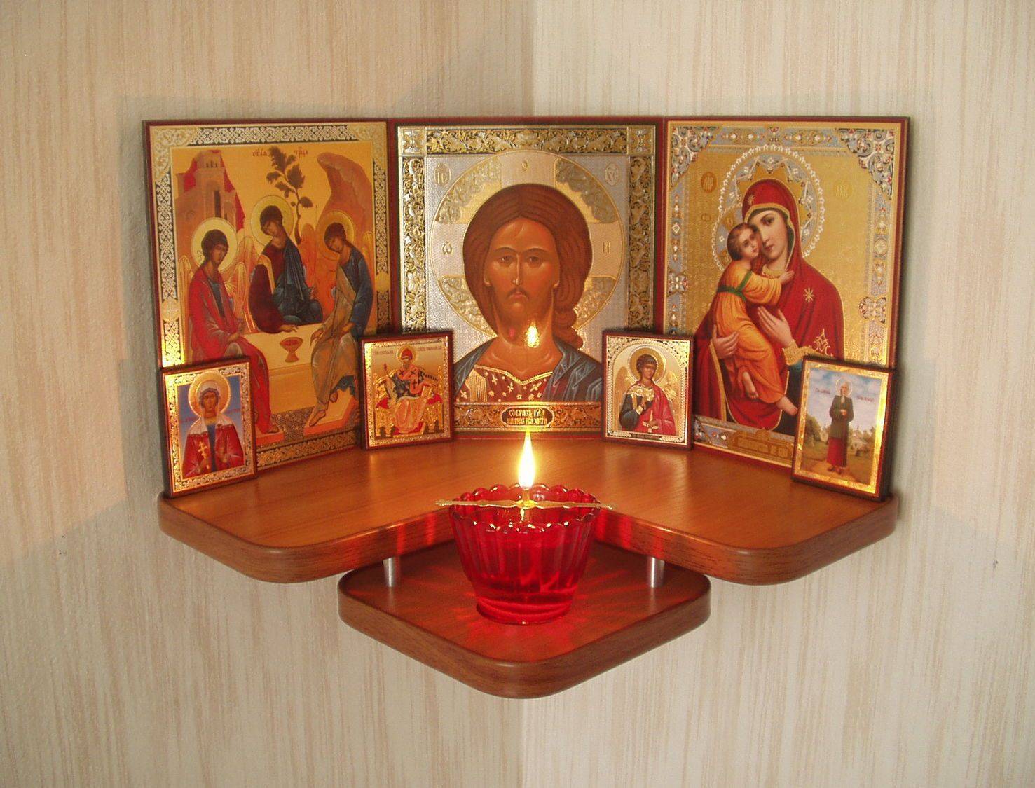 Сами иконы должны не висеть на стене, а стоять. Для этого принято оборудовать специальную небольшую полочку. Саму полочку украшают кружевной тканью: маленькой скатертью или салфетками. Иногда на нее ставят цветы, а также украшают в соответствии с православными праздниками. Например, ставят крашеные яйца на Пасху. Помимо этого, на полочку ставят лампаду со свечками. Сами свечи принято зажигать во время молитвы.