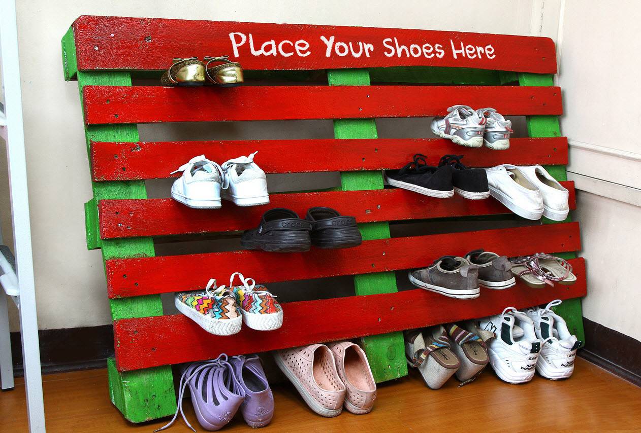 Выше мы уже рассматривали пример самодельной полки для обуви из обыкновенного поддона. Здесь же исходник для мебельного аксессуара тот же, с той лишь разницей, что его заметно “облагородили”, щедро добавив сочных красок.