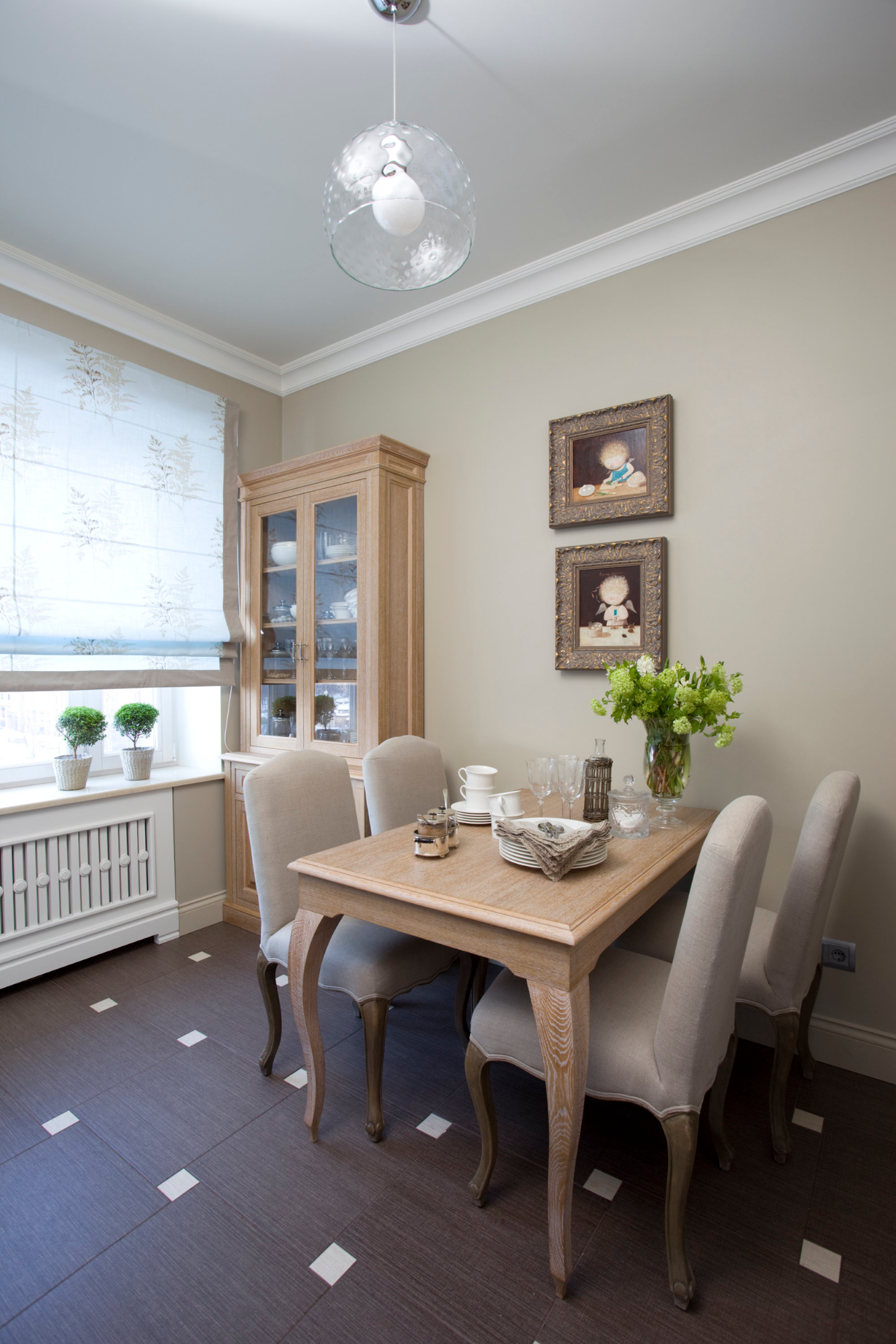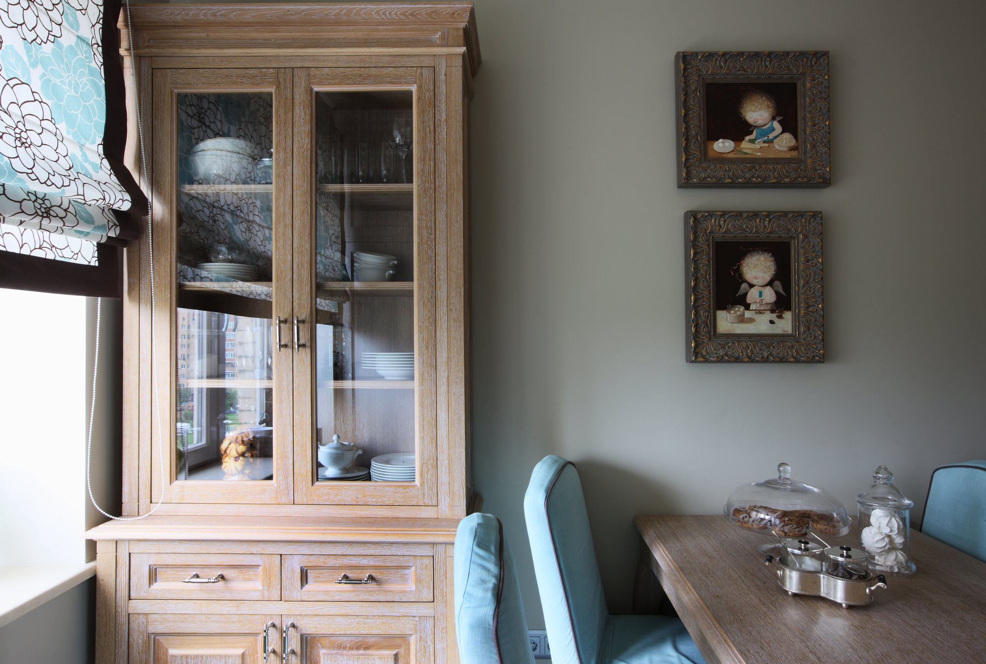 Сюжет для картин я выбрала соответствующий — ангелы, сидящие за столом. Иллюстрации выполнены в «детском» стиле, что делает их трогательными и вносит уют и непринужденность в этот классический интерьер.