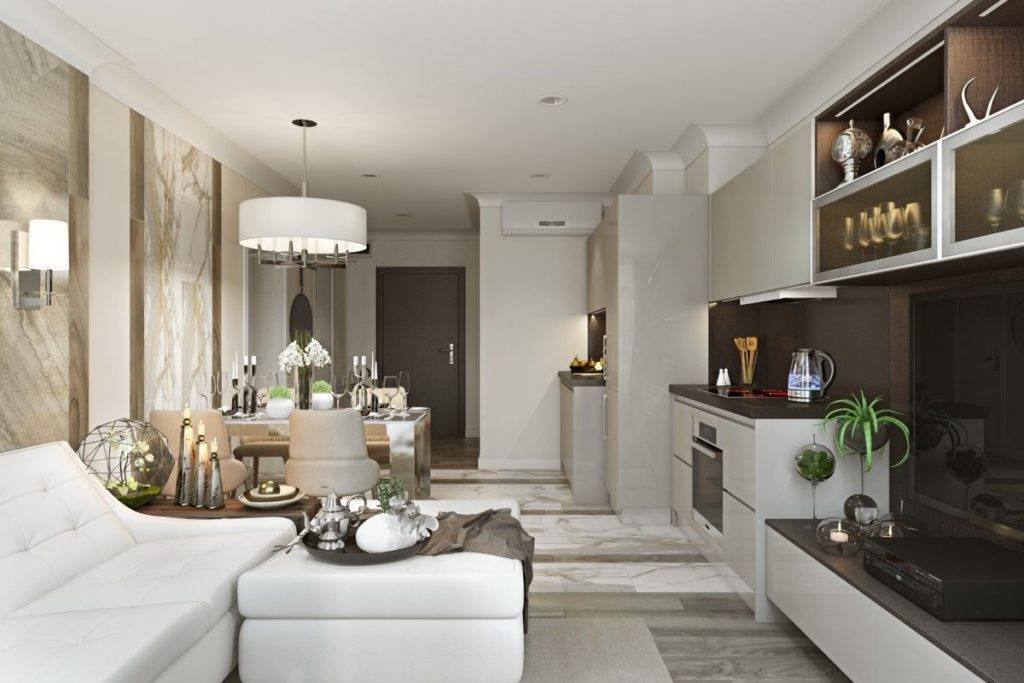 Психологи советуют добавлять в комнаты светлые тона, поскольку они не оказывают негативного воздействие на психологическое состояние человека. К преимуществам таких оттенков можно добавить визуальное увеличение высоты помещения. Чаще всего их используют для оформления следующих комнат квартиры: гостиной, коридора, кухни, спальни.