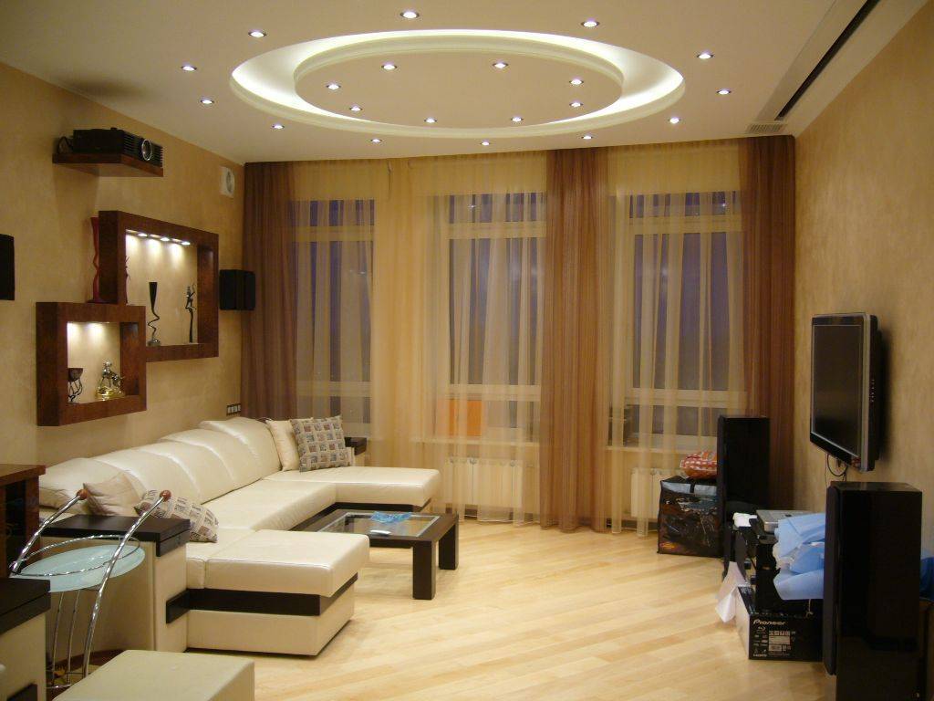 На фото – в зале установлен потолок из гипсокартона с несколькими уровнями.