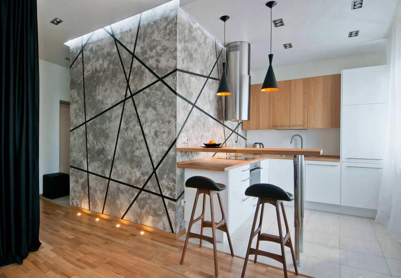 Комбинируйте источники света – применяйте общее центральное освещение и боковое точечное, чтобы скорректировать размеры кухни.