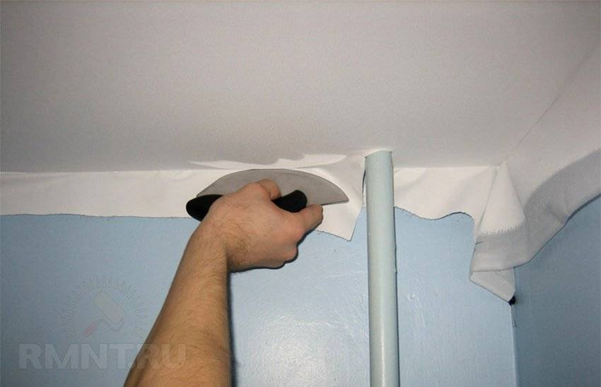 - самым ответственным этапом считается непосредственная установка потолка, во время которой натягивают плёнку. С помощью газовой пушки в помещении прогревают воздух, полотно размягчается, и его подвешивают за углы. Затем плёнку начинают фиксировать по всему периметру, заправляя ее под каркас с помощью шпателя;
