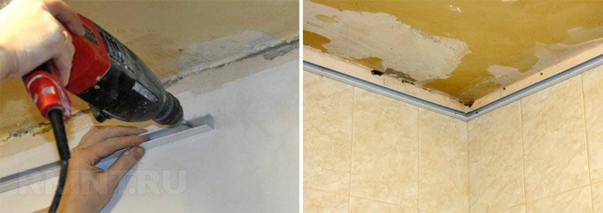 до того, как устанавливать натяжную систему, необходимо закрепить профили, которые послужат каркасом для конструкции. Их крепят горизонтально по уровню. Расстояние между крепежами не должно быть менее 15 см, при этом профили в углах не режутся, их просто разрезают и сгибают. Стыки профилей заделывают специальной лентой, предварительно очистив от загрязнений и удалив заусеницы;