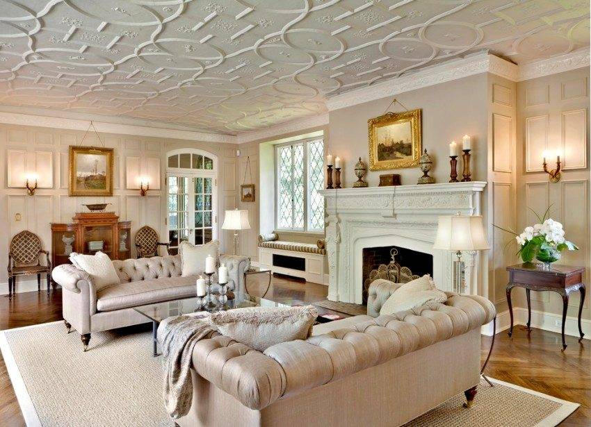 Потолок в гостиной оформлен с использованием пенопластовой плитки