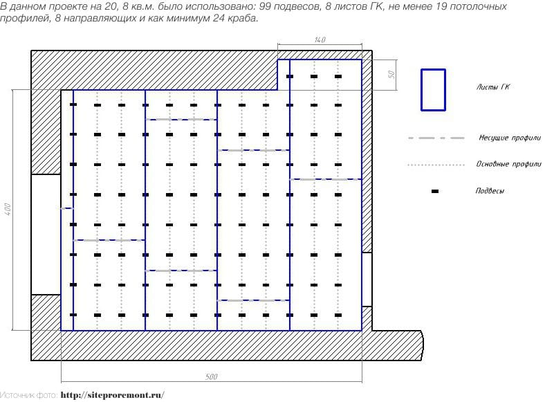 Нарисуйте от руки (с соблюдением масштаба) или в программе план вашего потолка и разместите на нем листы ГК, направляющие по периметру кухни, а несущие профили — поперек, затем пометьте, где будут расположены крабы и подвесы.
