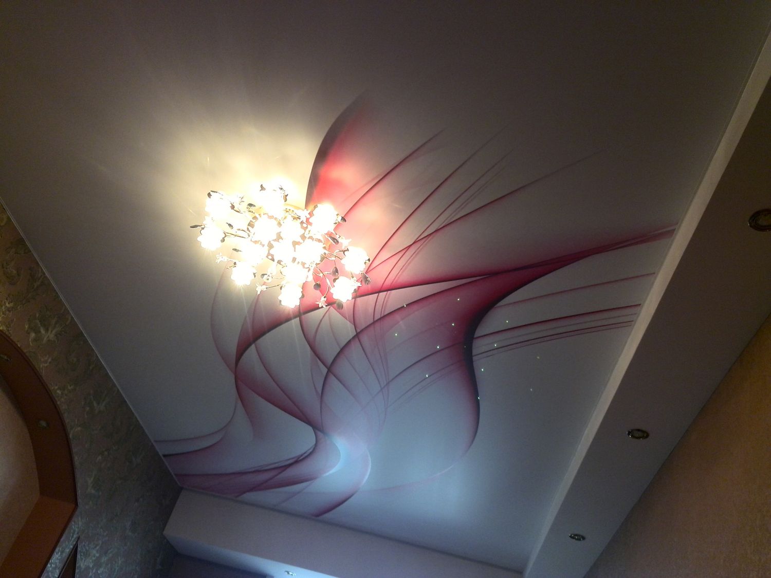 Методом термопечати на полотнах натяжного потолка можно создавать практически любые изображения. Это может быть абстрактный рисунок или известная картина, мозаичные панно или графика. Выбор остаётся за хозяином квартиры, главное, чтобы при этом ему не изменяло чувства вкуса и меры.