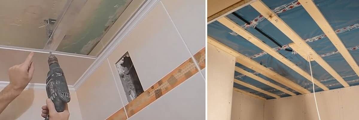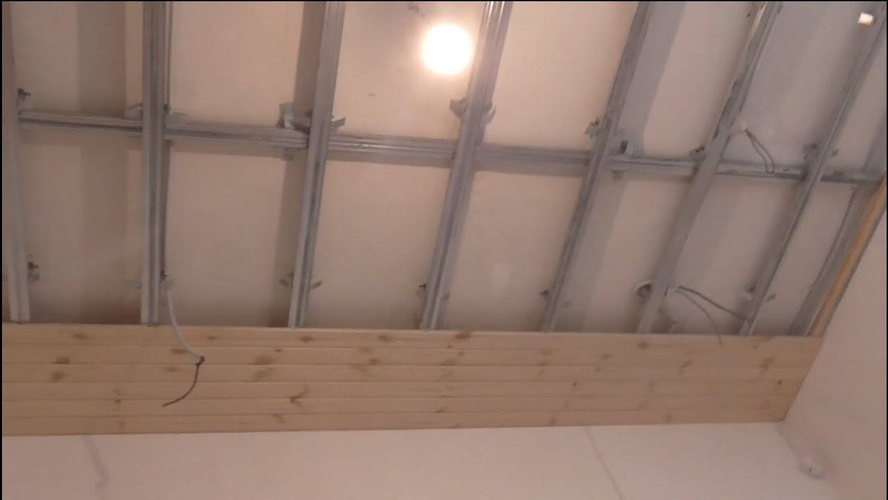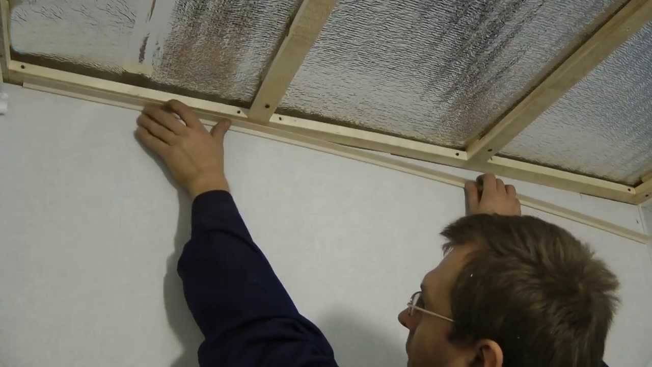В качестве каркаса используется деревянный брус. Дюбелями и ударными шурупами брус прикрепляется к потолку через каждые 60 см. Для выравнивания в один уровень, применяют деревянные подкладки между брусом и потолком.