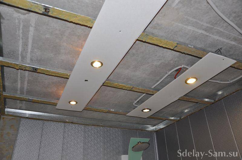 В местах предполагаемого крепления тяжелых элементов (таких, как люстра), между несущими элементами каркаса устанавливаются дополнительные перемычки.