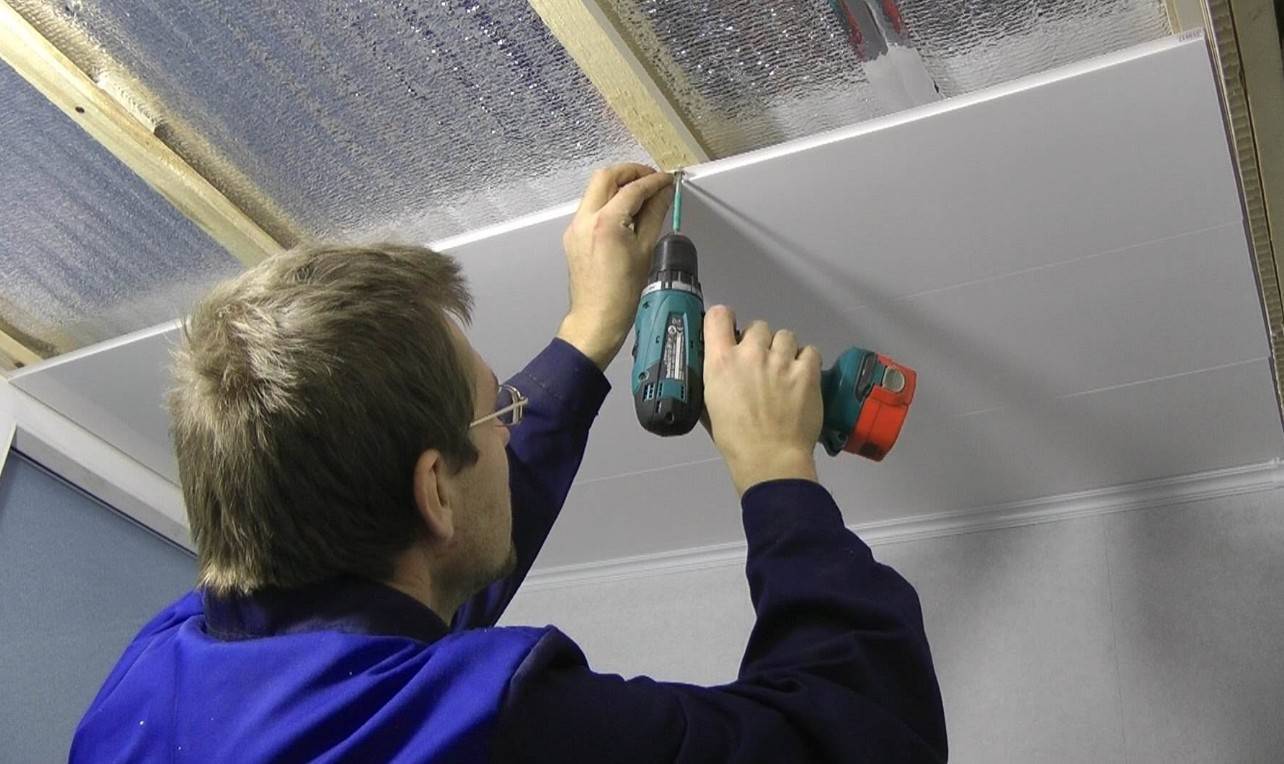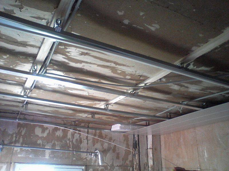 - К потолку крепят профили или деревянные бруски. Для контроля используют уровень. Расстояние между направляющими – 60-80 см, что исключит провисание ПВХ-планок, размещение – перпендикулярно стыкам панелей.