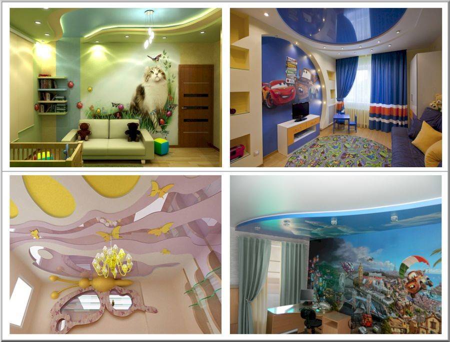 Потолок может закономерным продолжением игровой зоны. Разместите в комнате игровую конструкцию с качелями и канатами в форме столба, а при помощи фотопечати нанесите на покрытие крону дерева. Такая комната несомненно понравится ребенку и его друзьям.