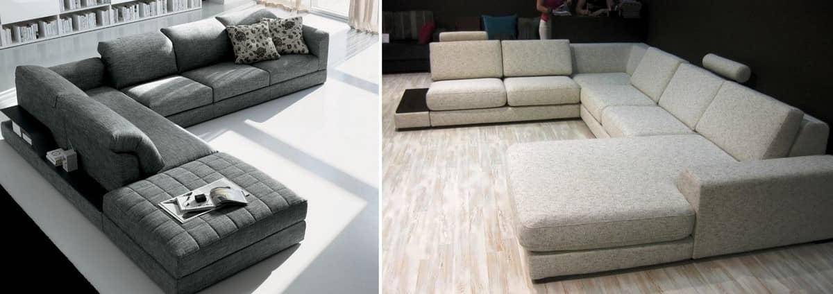 Диваны формы п отличаются широким выбором стилистического исполнения. Обивочные ткани должны первоначально соответствовать назначению комнаты. Для спален и детских комнат подойдут мягкие текстуры с натуральными волокнами: шенилл, велюр, флок, жаккард, хлопок. Такие ткани помогут создать атмосферу домашнего уюта, тепла. Главными критериями выбора выступают характеристики гипоаллергенности, экологичности, воздухопроницаемости.