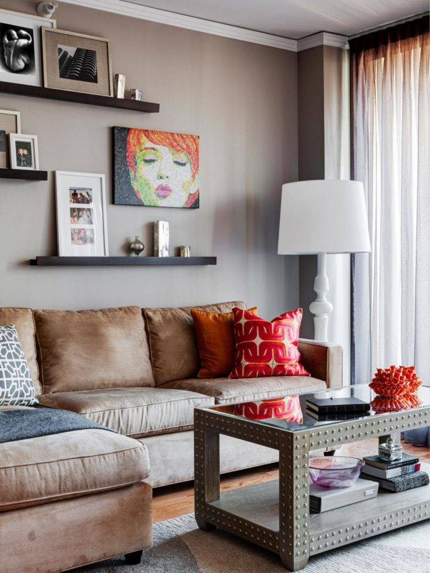 Мягкая и спокойная обстановка, созданная удачным сочетанием коричневого дивана с бежевой окраской стен
