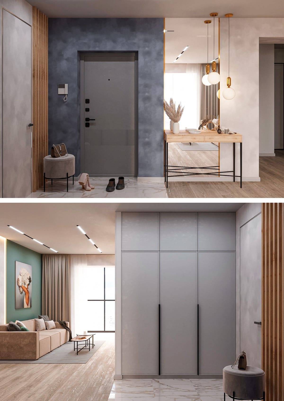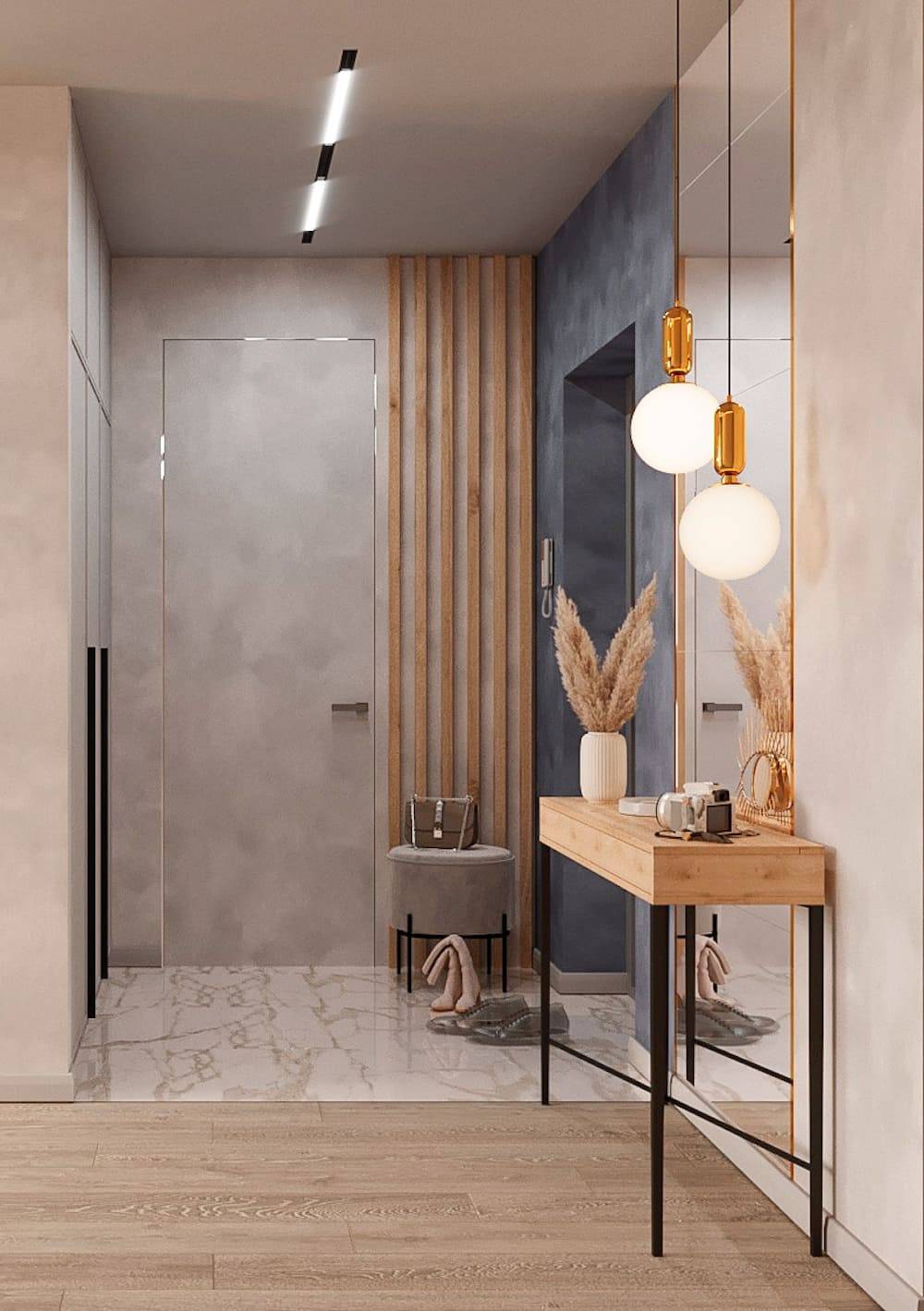 Подойдет также дерево и натуральный камень. Также будут актуальны модные обои для прихожей 2022. Для бюджетных вариантов хорошим вариантом станет покраска стен.