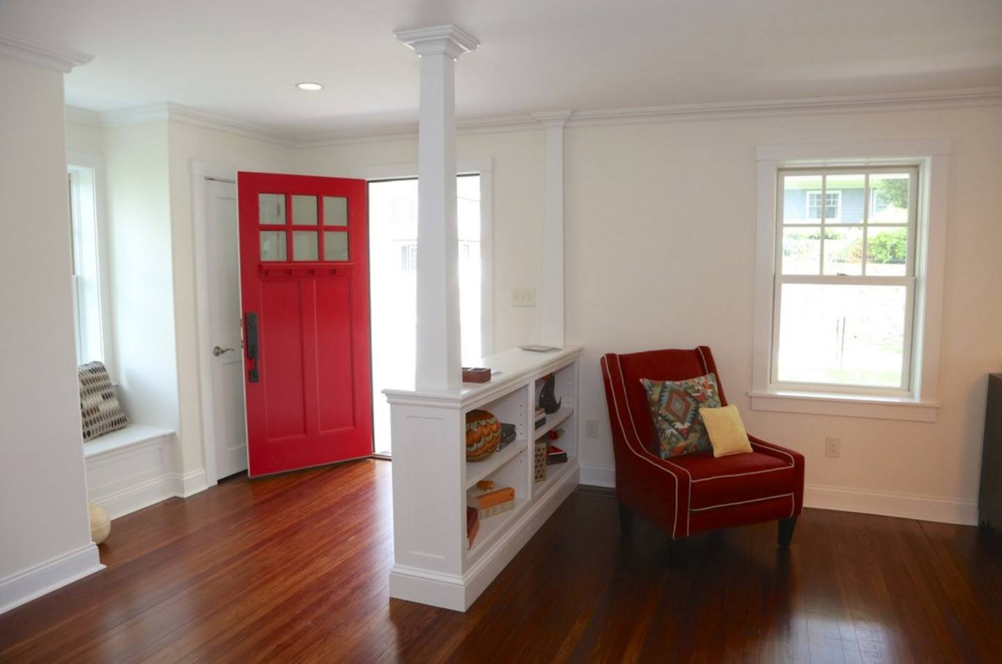 Выбор отделки, используемой мебели и декоративных элементов для расстановки акцентов и украшения помещения должен падать на материалы, способные выдержать постоянные изменения температуры и уровня влажности из-за близости входной двери.