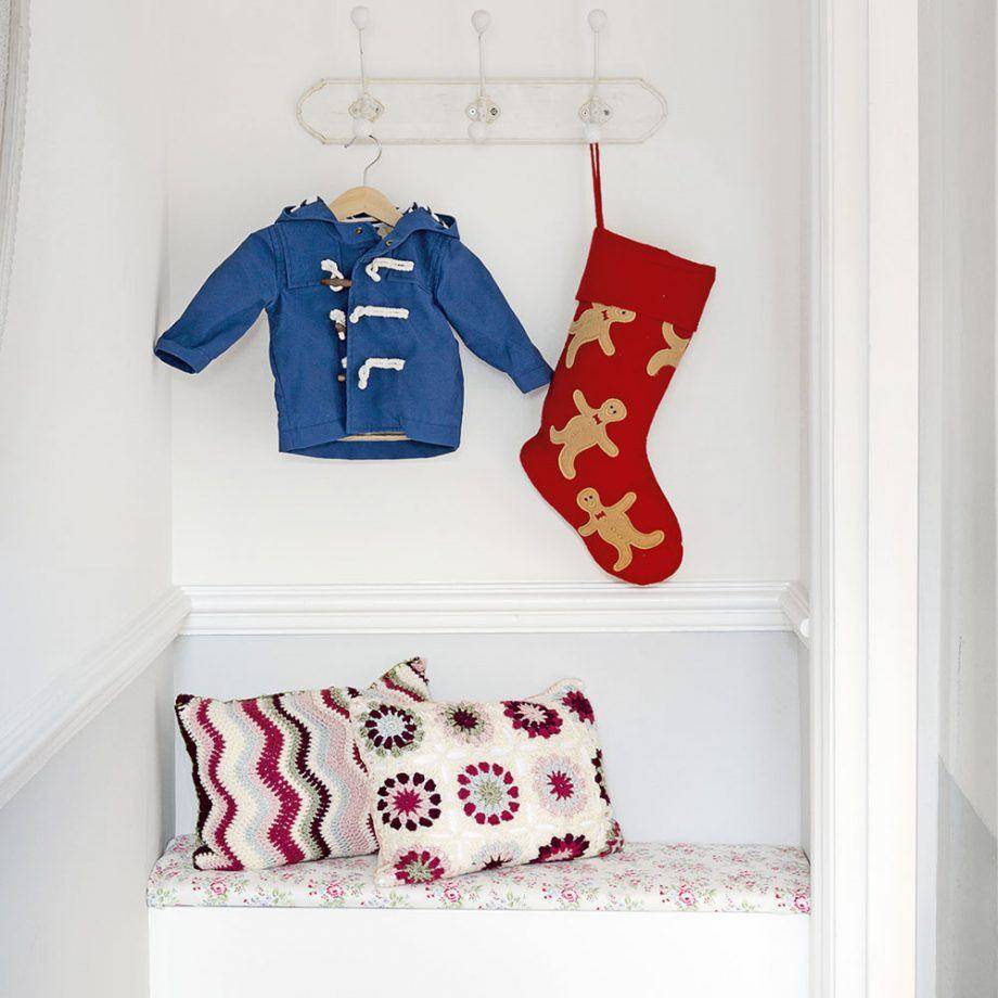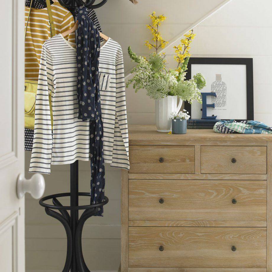 Выбирайте вытянутые неглубокие шкафы, чтобы уместить всё необходимое и при этом сохранить свободное пространство. Если семья небольшая или вы живете в квартире-студии, вместо шкафа можно использовать крючки на стену.