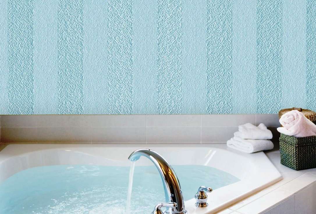 Само слово – стекло – говорит о том, что вода и пар им не страшны. Основа стеклообоев – стекловолокно с крахмальной пропиткой, дающее после нанесения на стены долговечное покрытие, которое можно много раз перекрашивать, если захочется обновить дизайн ванной комнаты. Вариант отделки — не из дешевых, но, учитывая его долговечность, экологичность и высокие влагостойкие качества – один из популярных.