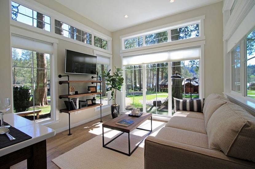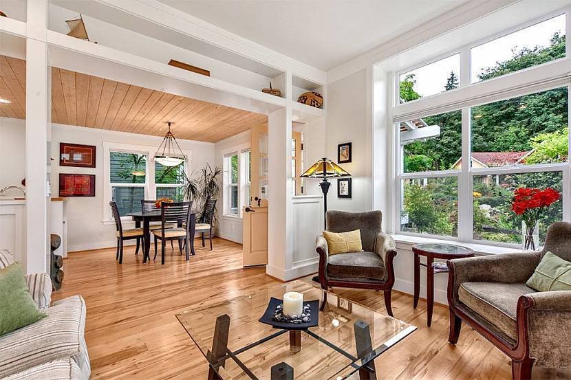 Гостиная с большим окном и светлой отделкой не кажется маленькойИсточник idesignarch.com