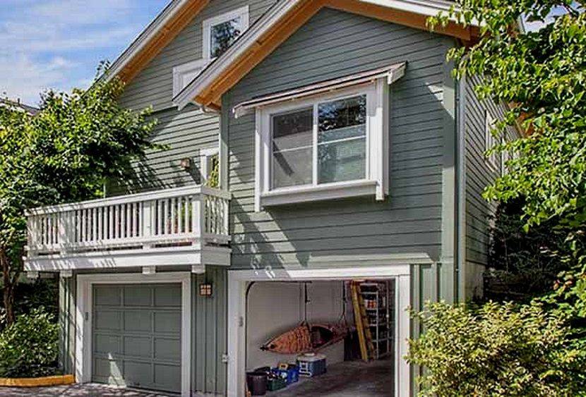 Гараж, пристроенный к дому или размещенный на цокольном уровне, позволит значительно сэкономить место. При такой планировке стоит заранее продумать, где расположить дверь в помещение, чтобы на веранду или прихожую не проникали пары бензина.