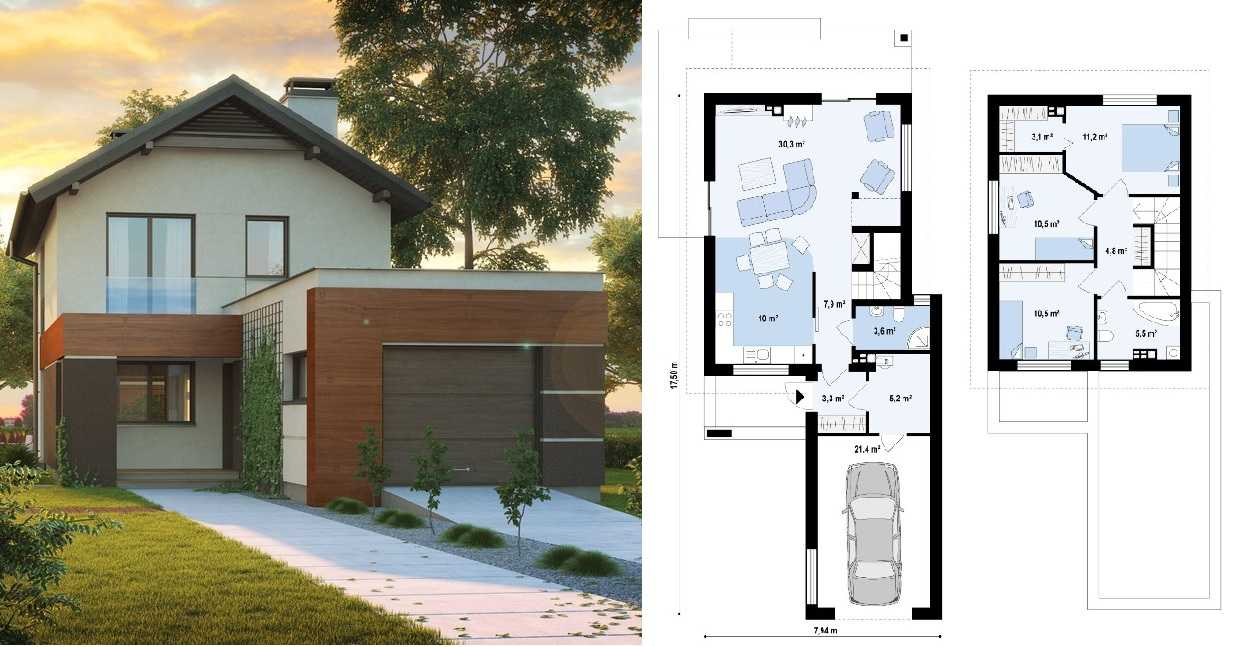 Проект небольшого двухэтажного дома для дачи с пристроенным гаражом: жилая площадь 100 м², общая 127 м², гараж на одну машину