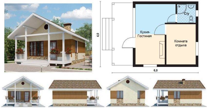 Рассмотрим подробнее строительство из клееного бруса по проекту дачного домика для 6 соток. Фото таких сооружений можно часто встретить на строительных сайтах. Наш домик будет иметь площадь 6х4 м. В доме будет кухня, комната отдыха и маленькая открытая терраса, на которой имеется печь для приготовления барбекю. Ее же используют в качестве источника тепла в доме зимой.