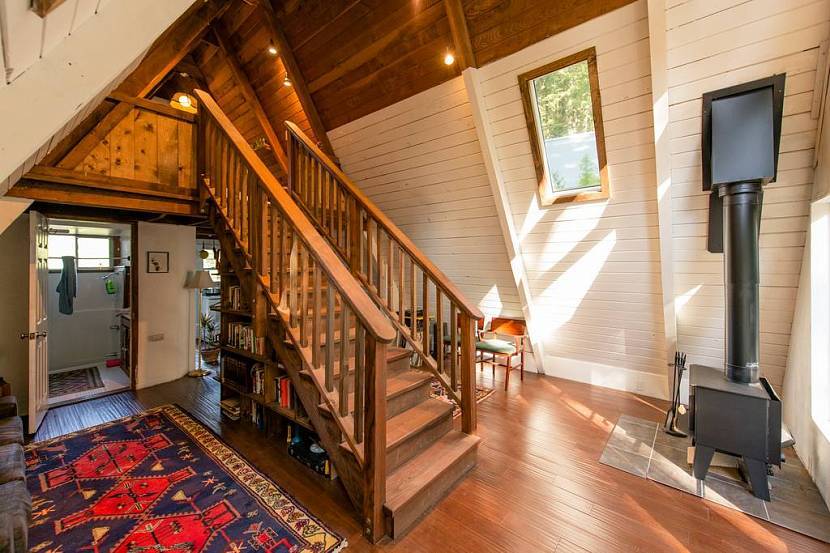 Другое — немного большее спальное место, расположено над гостиной, где лестница интегрирована с настенными книжными полками.