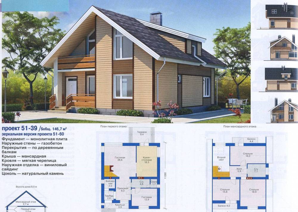 Выше приведен еще одни интересный проект дома с мансардой из пеноблока с общими размерами 8×10 (9,7) метров. Можно заметить, что на первом этаже есть отдельное помещение для топочной. Там удобно расположить не только газовый, но и котел на твердом топливе. Благодаря достаточному пространству, есть где сложить дрова. Кроме того, на крыльце дома можно оборудовать Небольшие полочки для дополнительного запаса дров. Есть тамбур, который будет служить отличным изолятором от того, чтобы тепло уходило через двери. В нем можно расположить небольшую вешалку для верхней одежды.