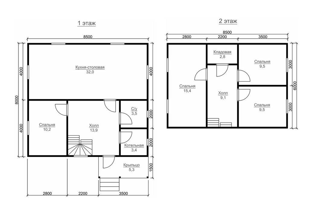 Второй этаж – спальная зона, первый этаж – комнаты общего пользования. План дома также должен учитывать прямой доступ в комнаты, то есть смежных помещений в нем быть не должно. Готовая планировка дома 8х10 поможет предусмотреть фундамент не только под несущие, но и под разделительные стены.