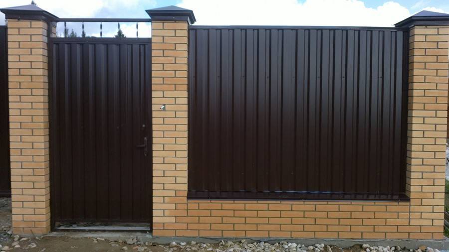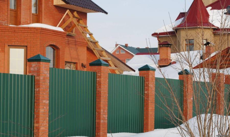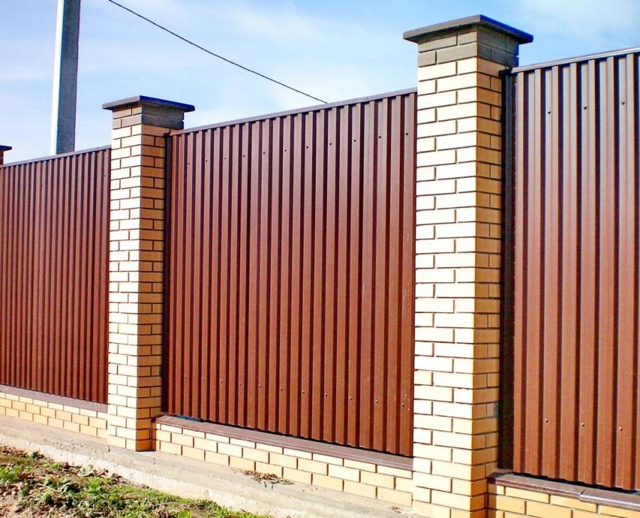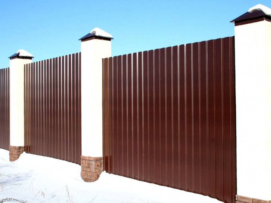 На фото изображен забор из профнастила с декоративными столбами.