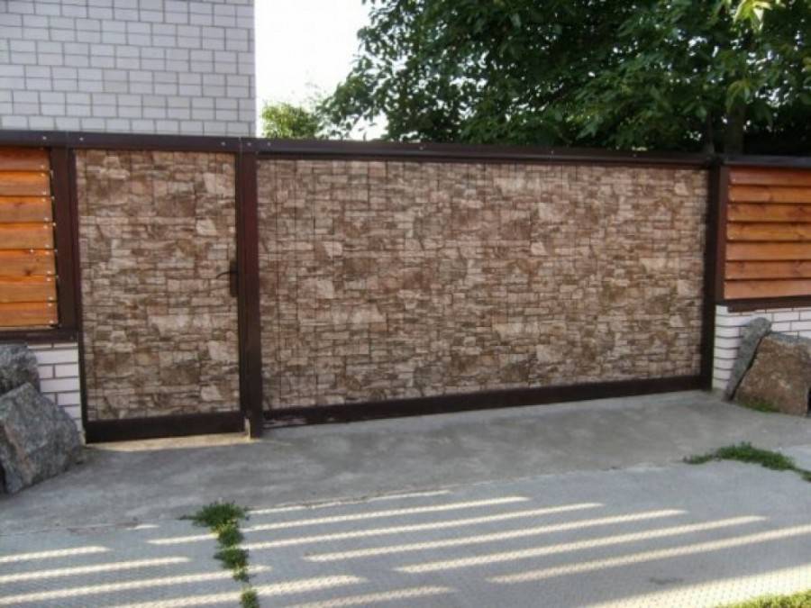 Забор из профнастила под камень выглядит солидно и красиво, так же он хорошо сочетается со столбами из кирпича или природного камня. Профнастил с имитацией кирпичной кладки по популярности находится на третьем месте.