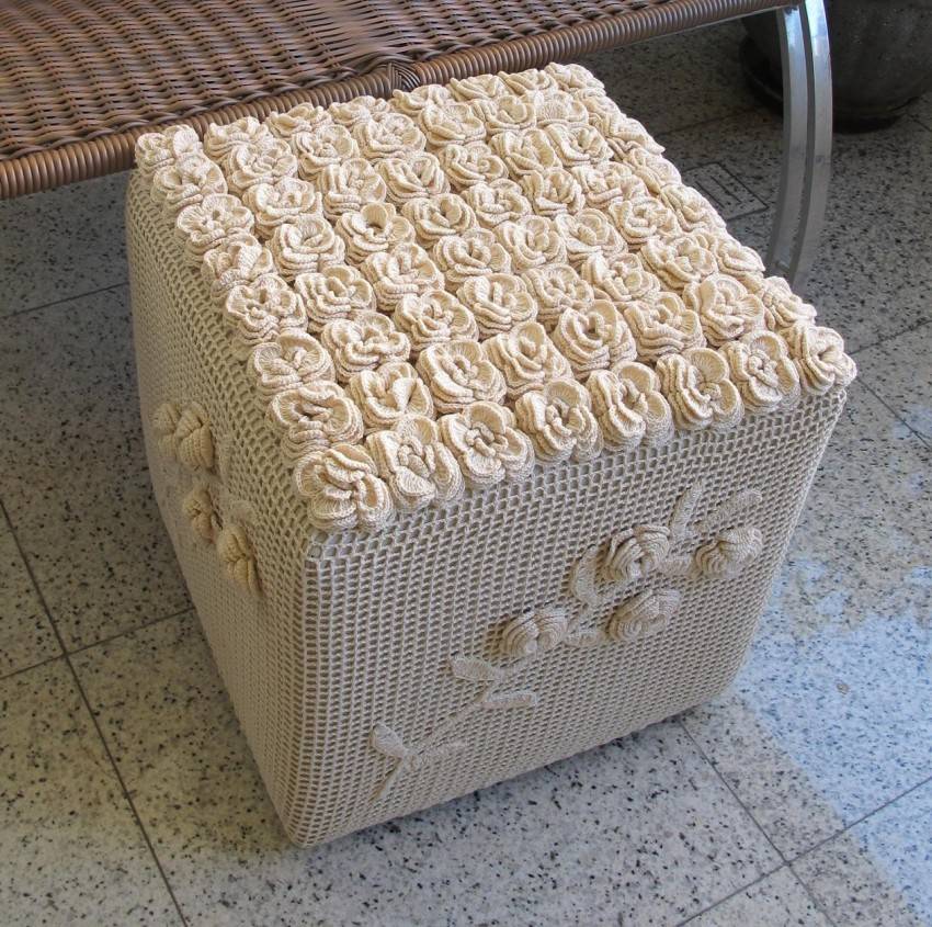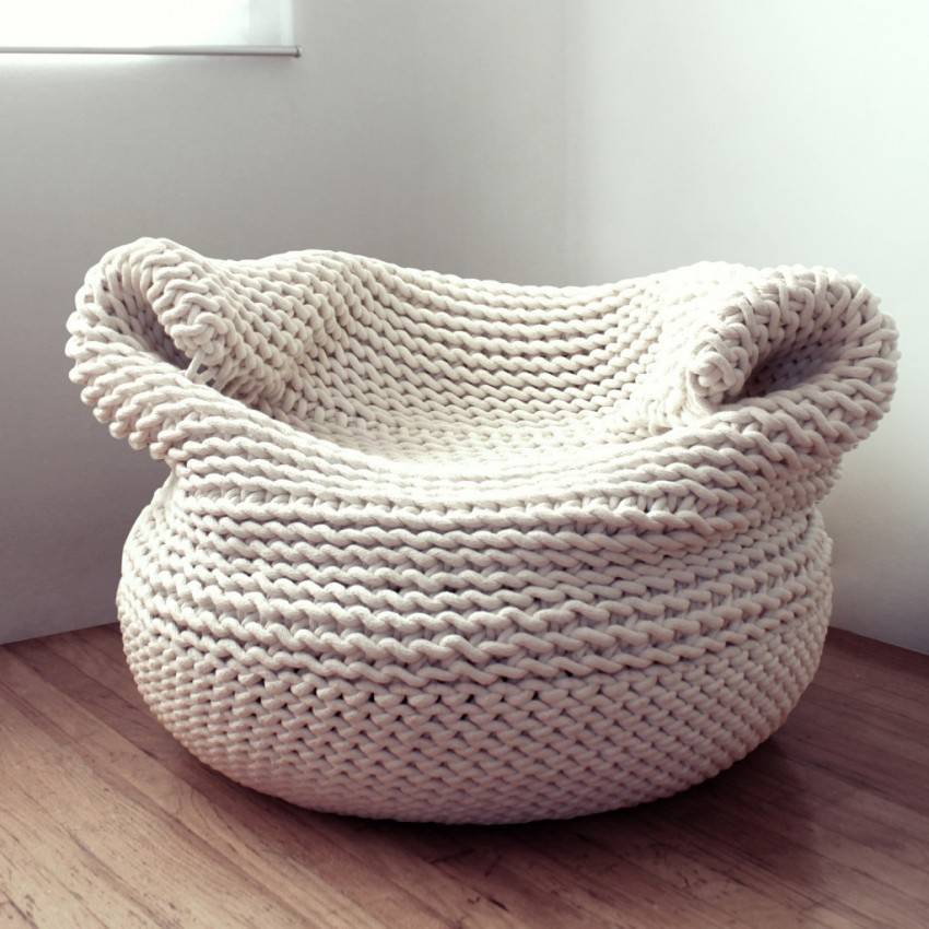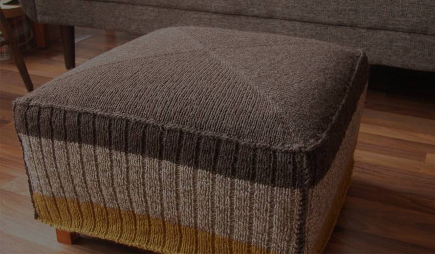 Вязаный пуфик отличается своим удобством и легкостью. Связать его можно как спицами, так и крючком.