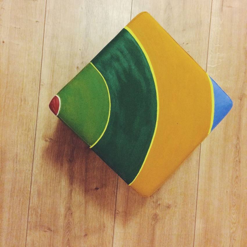 - Ножки табурета покрасьте в яркие цвета. Можно дополнительно нанести несколько слоев прозрачного акрилового лака для придания глянцевого блеска.