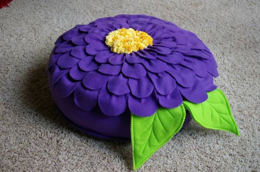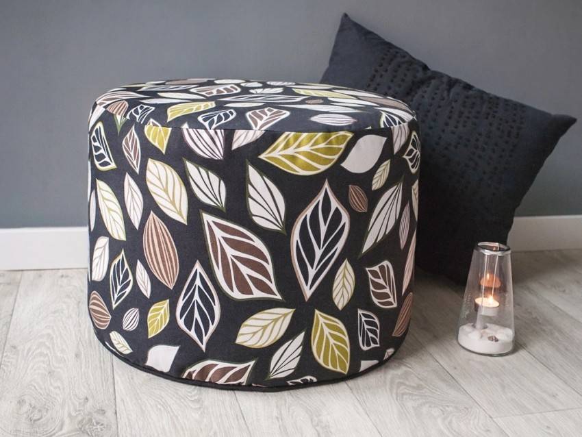 Остается пуфик украсить. Для этого на него шьют декоративный чехол. Порядок действий такой же как указано выше. Только в средней части не зашивают отверстие, а вставляют в него молнию, пришивают липучку или пуговицы. Ткань для декоративного чехла может использоваться совершенно любая.