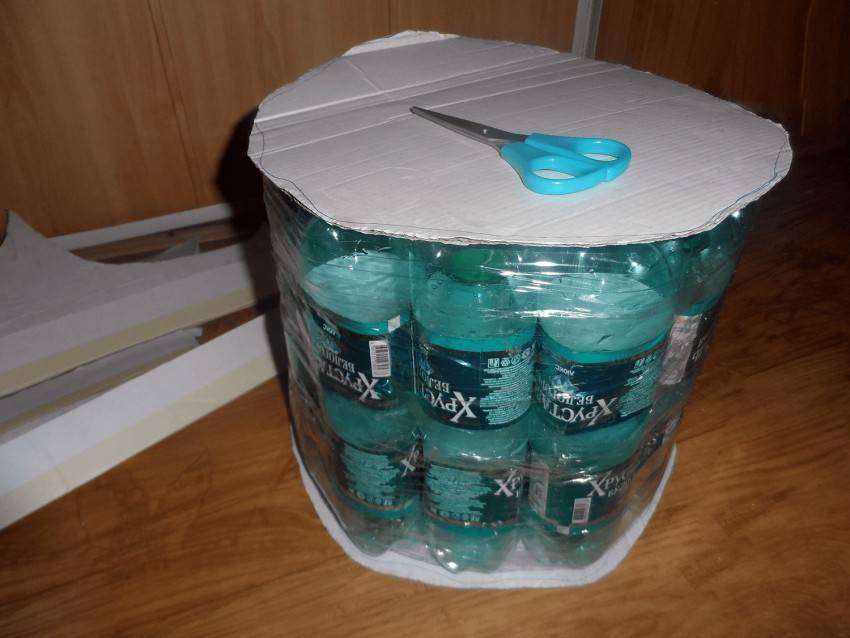 Для изготовления низкого пуфика берут литровые бутылки, для высокого – двухлитровые.