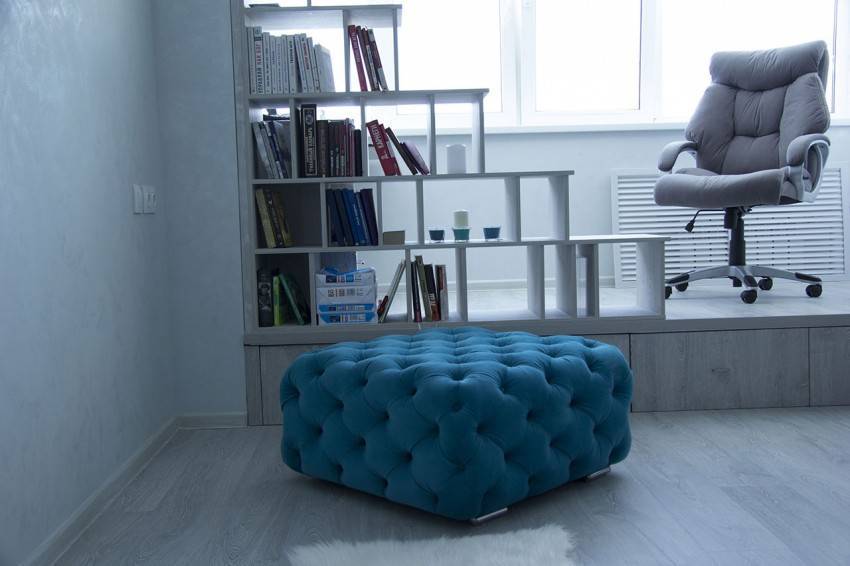 Для придания комнате оригинального и эксклюзивного внешнего вида, пуф стоит сделать ярким и красочным. Для детских комнат выбираются насыщенные цвета голубого, розового, бирюзового окраса.