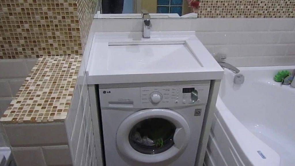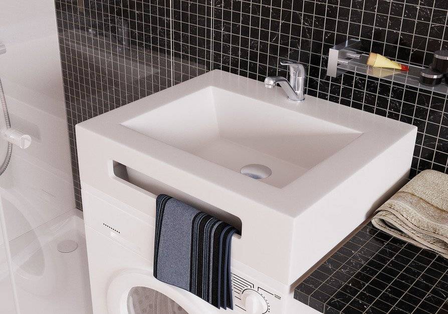 Если над машинкой установить раковину, то можно полноценно умываться, чистить зубы и делать все необходимые гигиенические процедуры, не замечая при этом наличия дополнительного прибора под ней.