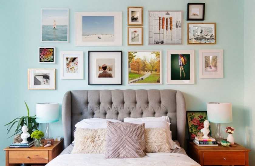 Если комната небольшая, стоит воздержаться от большого количества рам на стенах. Они создадут ощущение визуальной тесноты, сузят свободное визуальное пространство. Идеальным вариантом будет размещение 2-3 самых важных фотографий на стене и еще 1-2 фотографий на полках.