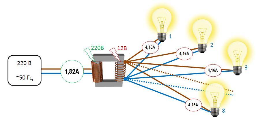Но никто не прокладывает такой мощный кабель, обычно для осветительной проводки используют провод сечением 1,5 мм. Длительно допустимый ток из ПУЭ для медного проводника сечением 1,5 мм2 — 19А. Чтобы исправить положение нужно тонким кабелем доставить 220 В от осветительной коробки под потолок до трансформатора или, лучше, двух трансформаторов. А уже от каждого трансформатора толстым проводом по потолку соединять 12-ти вольтовые светильники. Также можно выполнить разводку под рабочее напряжение 220 В и малый ток, а на каждый светильник установить свой маломощный мини-трансформатор.