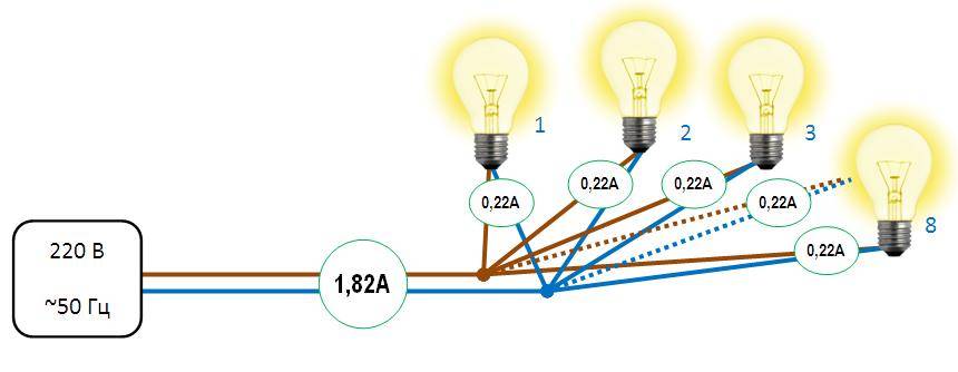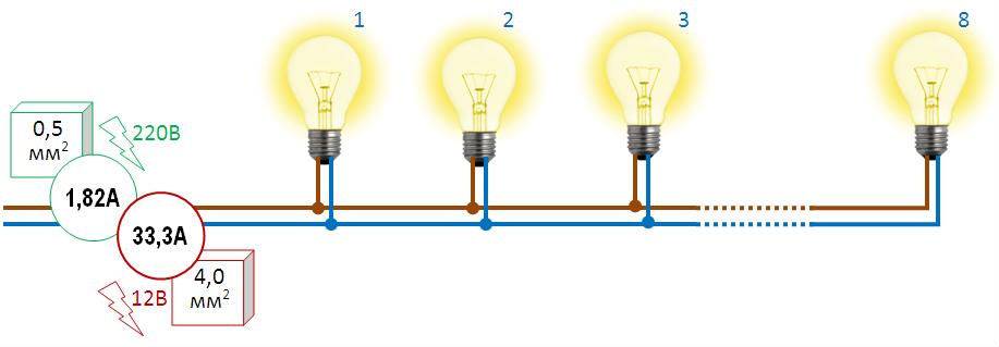 Рассмотрим параллельную схему включения электропроводки. Если будут использоваться лампы под напряжение 220 В, то получим суммарный ток 400 Ватт/220В =1,8181 А. Значит, сечение провода для такой гирлянды должно быть примерно в 10 раз меньше – не менее 0,1818 кв. мм. При использовании 12-ти вольтовых ламп – получаем ток 400 Ватт/12В = 33,3333 А и соответственно сечение 3,33 кв. мм!