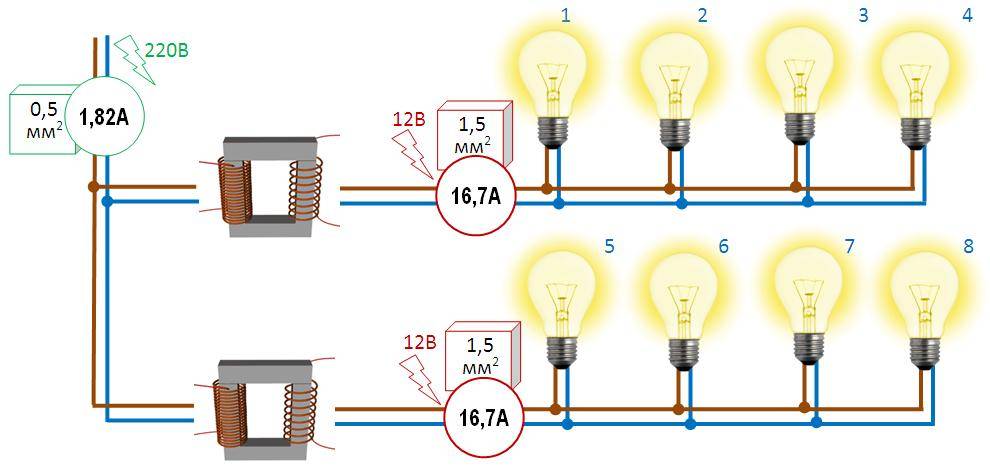 Для осветительной электропроводки в подавляющем большинстве случаев используется кабель с сечением жил 1,5 кв. мм типа ВВГнг или многожильный провод суммарным сечением 0,75 кв. мм. типа ПВС. Если вы располагаете этими двумя инструментами, то сможете оценить токовую загрузку схемы и определить место, где нужно поставить один или несколько трансформаторов.