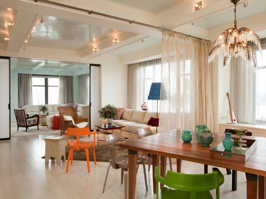 Для зонирования помещения с большой площадью использованы два вида перегородок — раздвижная конструкция и штора-перегородка из ткани