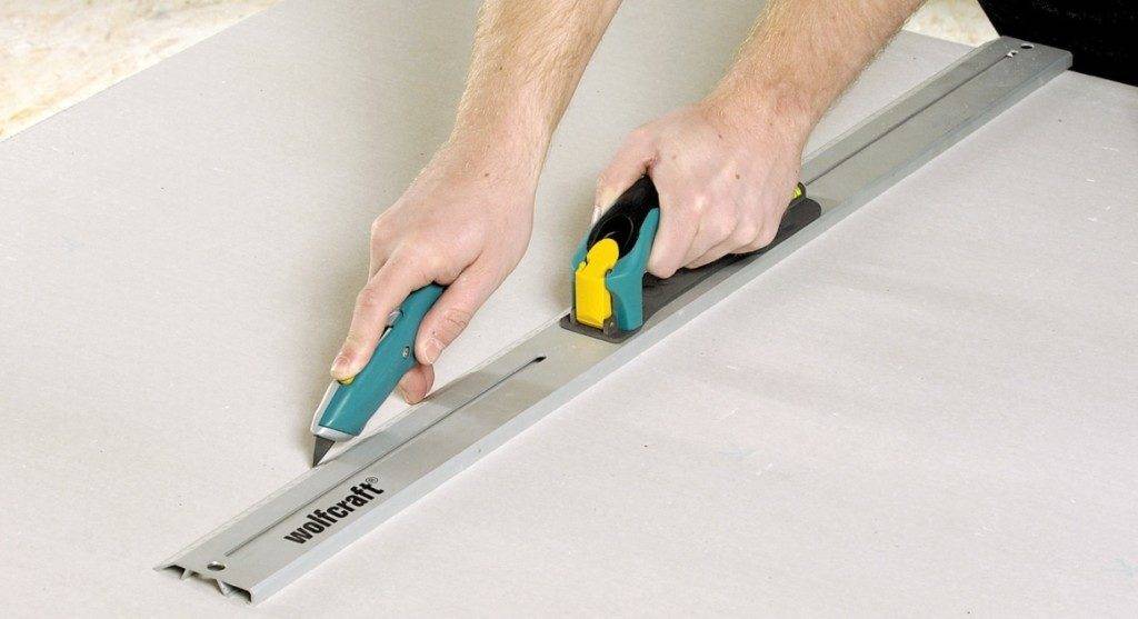 После проведения точных замеров на листах гипсокартона вычерчивают детали соответствующих размеров, после чего вырезают их при помощи специального ножа.