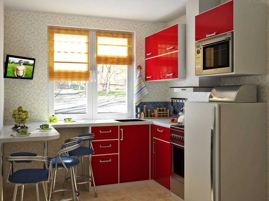 Тумбы, шкафы, бытовые приборы устанавливают у стены с оконным проемом, также занимают подоконник и смежную стену. В этом случае успешно задействуют угол, смежный с комнатным помещением.