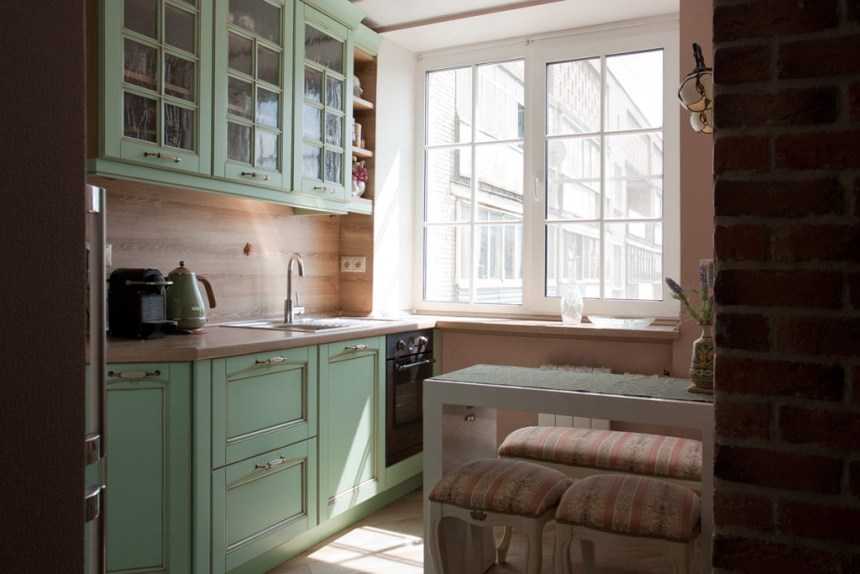 В таких ситуациях можно прибегнуть к способу расширения пространства с помощью оконного проёма. Большее количество пропускаемого в комнату света позволит визуально сделать кухню просторней.