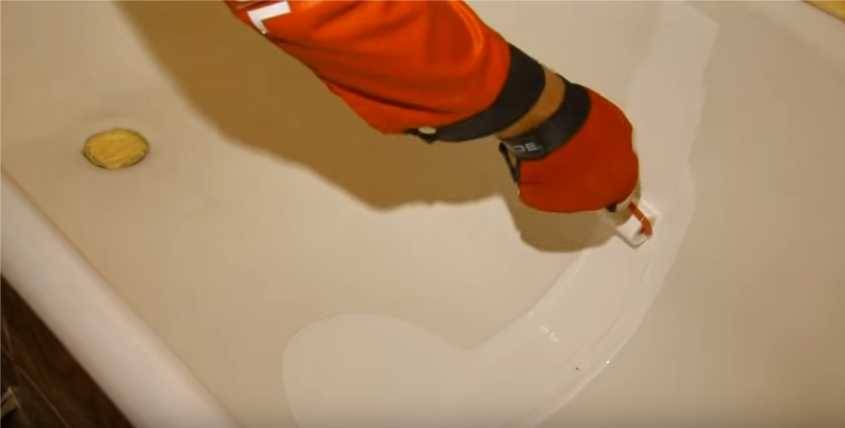 В отличие от краски акрил наносят не кисточкой, а просто разбрызгивают по бортикам ванны.