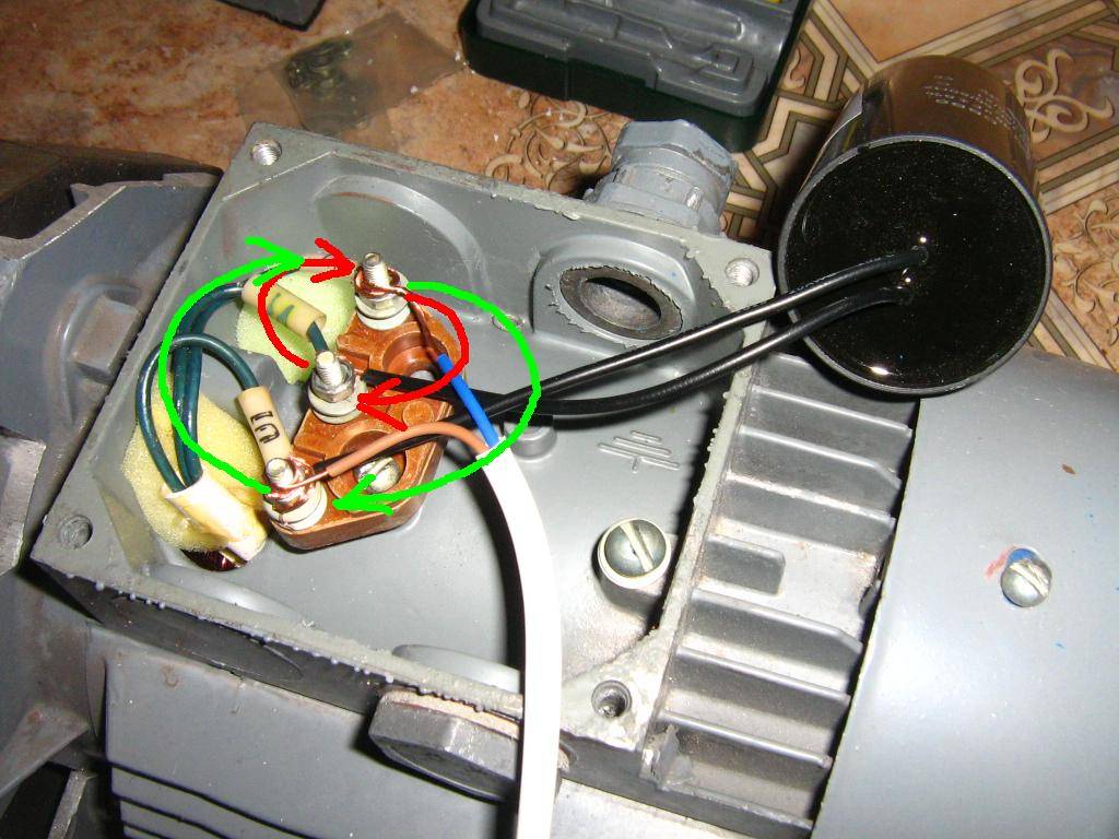 Два вывода конденсатора подключаются между собой. К двум другим происходит подключение пусковой кнопки. Средний вывод трехпозиционного переключателя подключается к конденсаторам в том месте, где они объединены между собой. Два других вывода подключаются к клеммам двигателя, на которые приходит питание. Конденсаторы подключаются к выходу обмотки, которая применяется для запуска. Кнопка включения ставится в разрыв фазного провода.