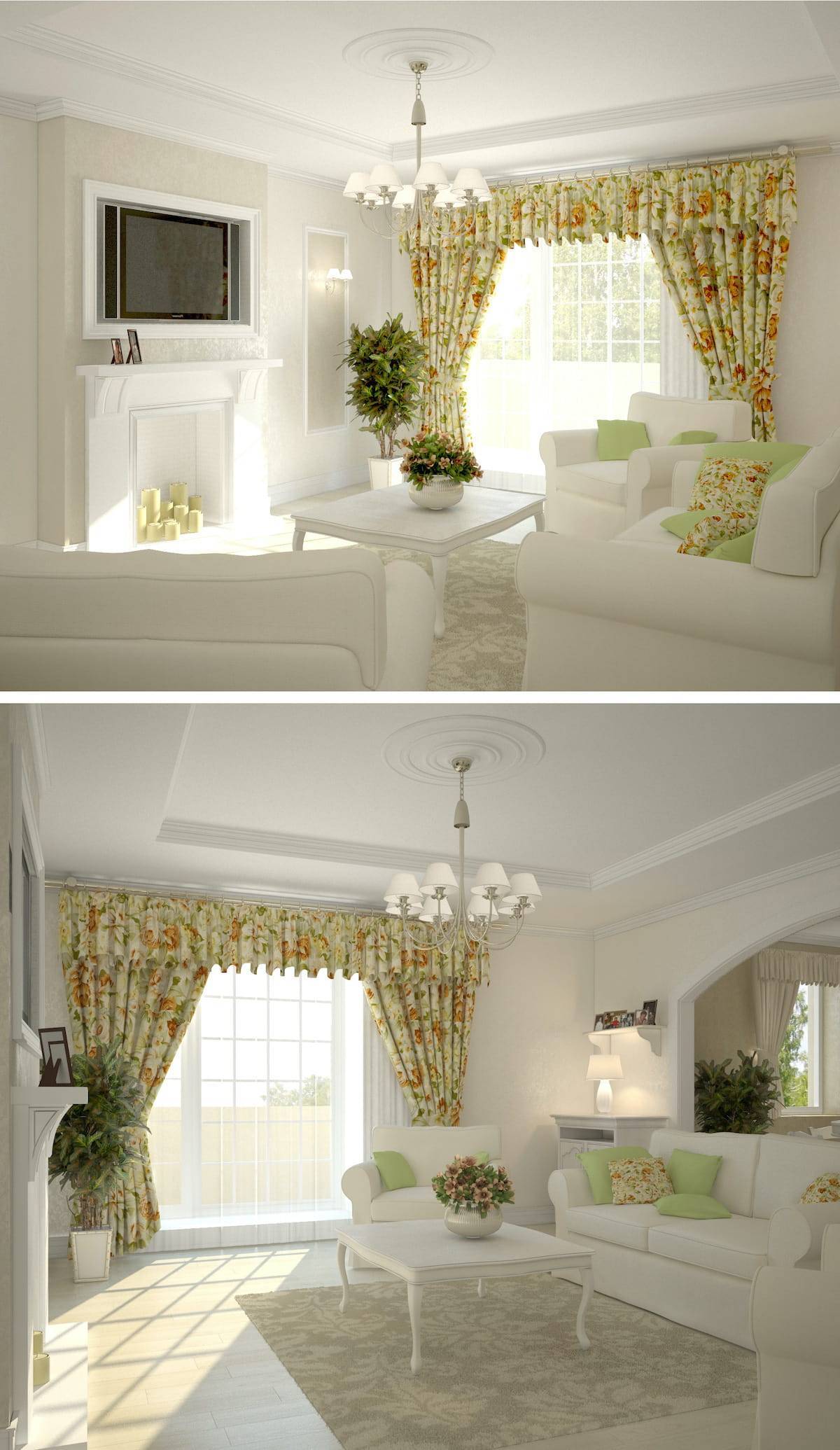 На заметку! Белый цвет штор прекрасно будет сочетаться с белым диваном и небольшим количеством яркого декора (например, диванные подушки).